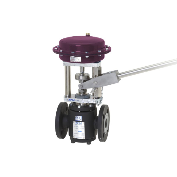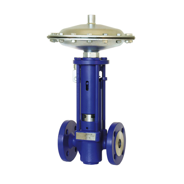 Gambar ini menunjukkan sebuah katup blowdown yang digunakan untuk mengeluarkan cairan atau gas dari sistem, mengurangi tekanan, atau menghilangkan kontaminan. Katup ini memiliki bodi berwarna biru dengan dua flensa di bagian bawah dan sebuah aktuator berbentuk kubah di bagian atas.